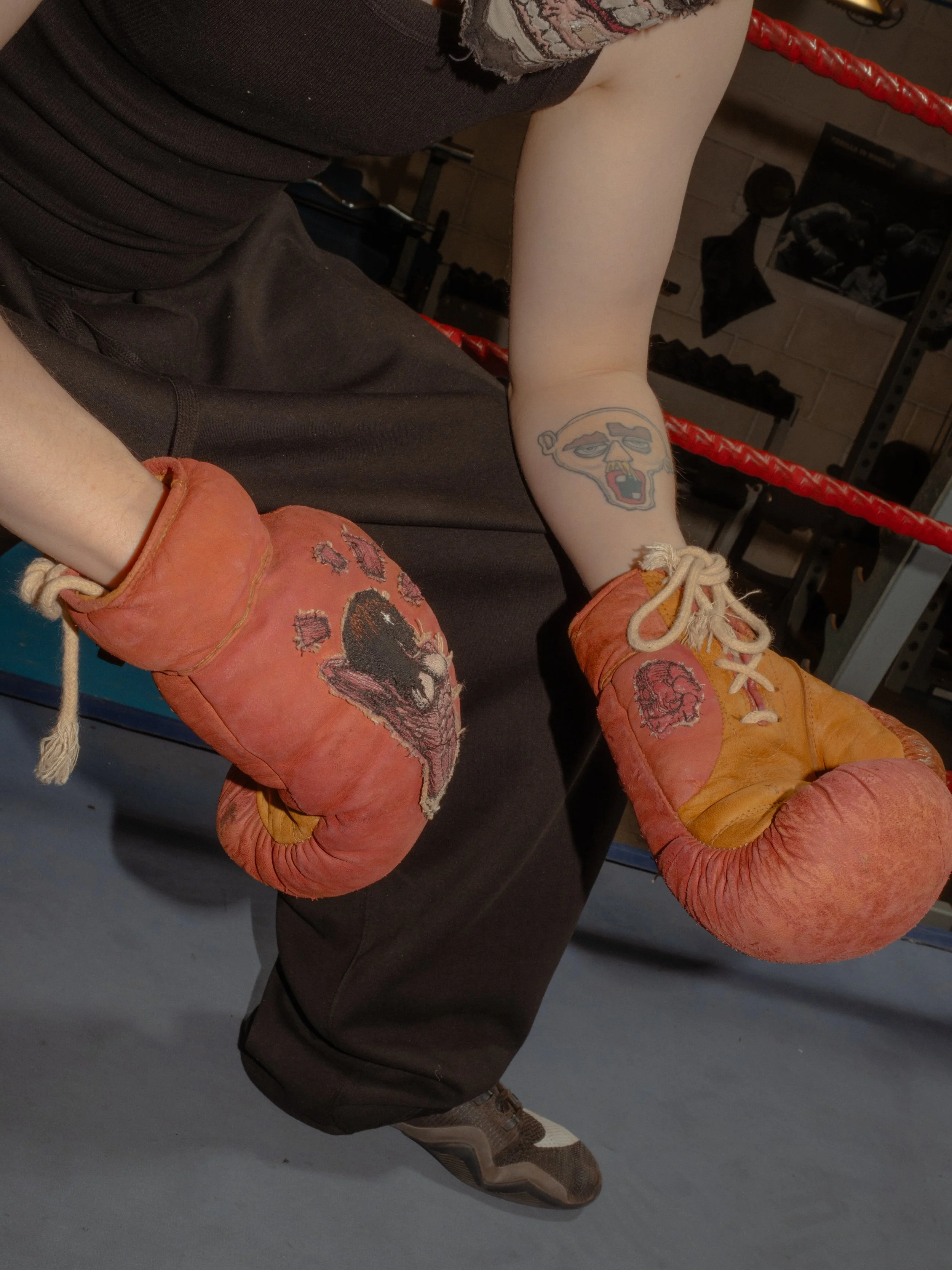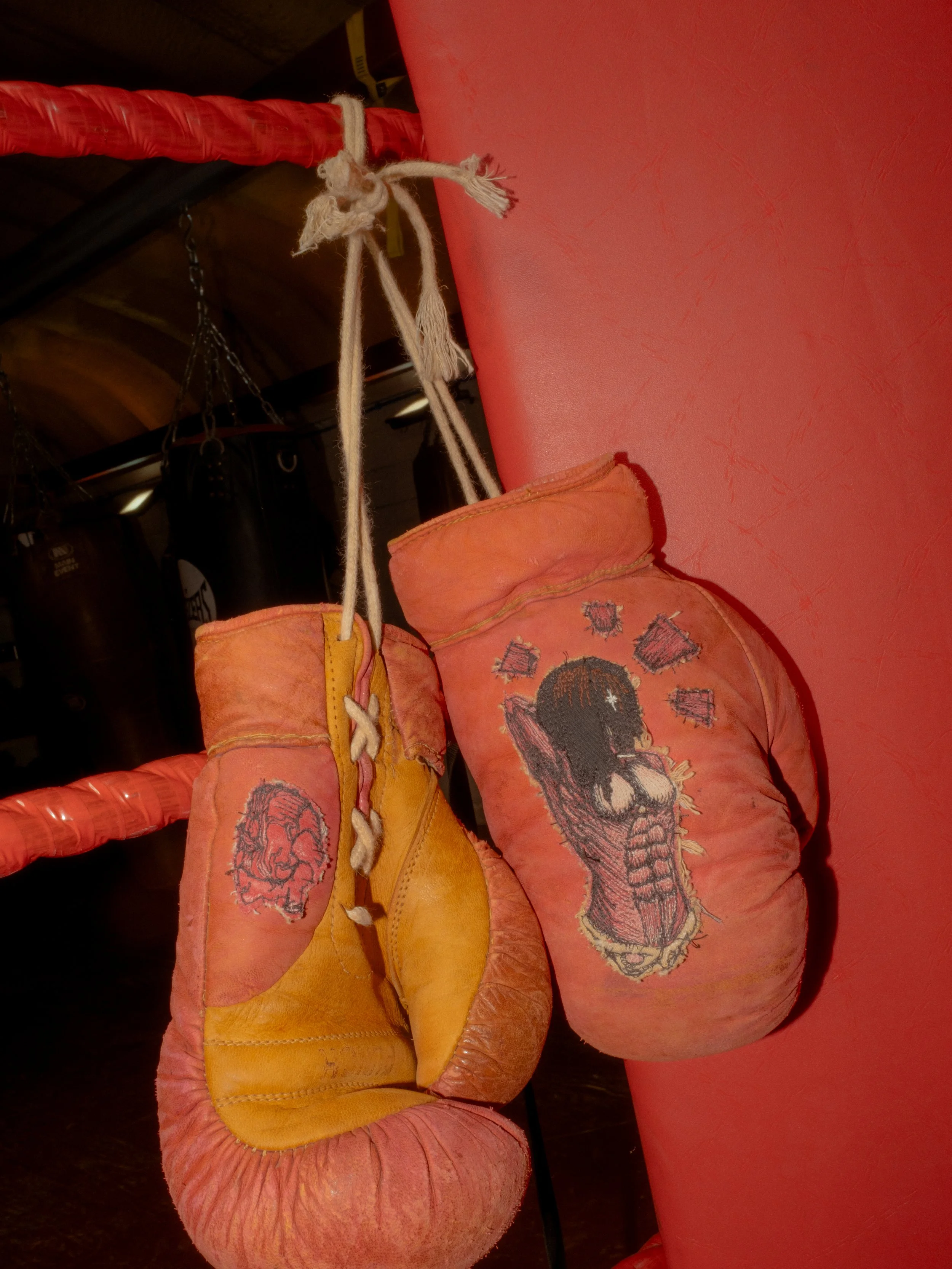 Tsuki-ko Tsukiko: the unfortunate young lady returns. ready for a fight.Featured on a pair of vintage leather boxing gloves. with authentic musty scent.embroidery and fabric. enquire